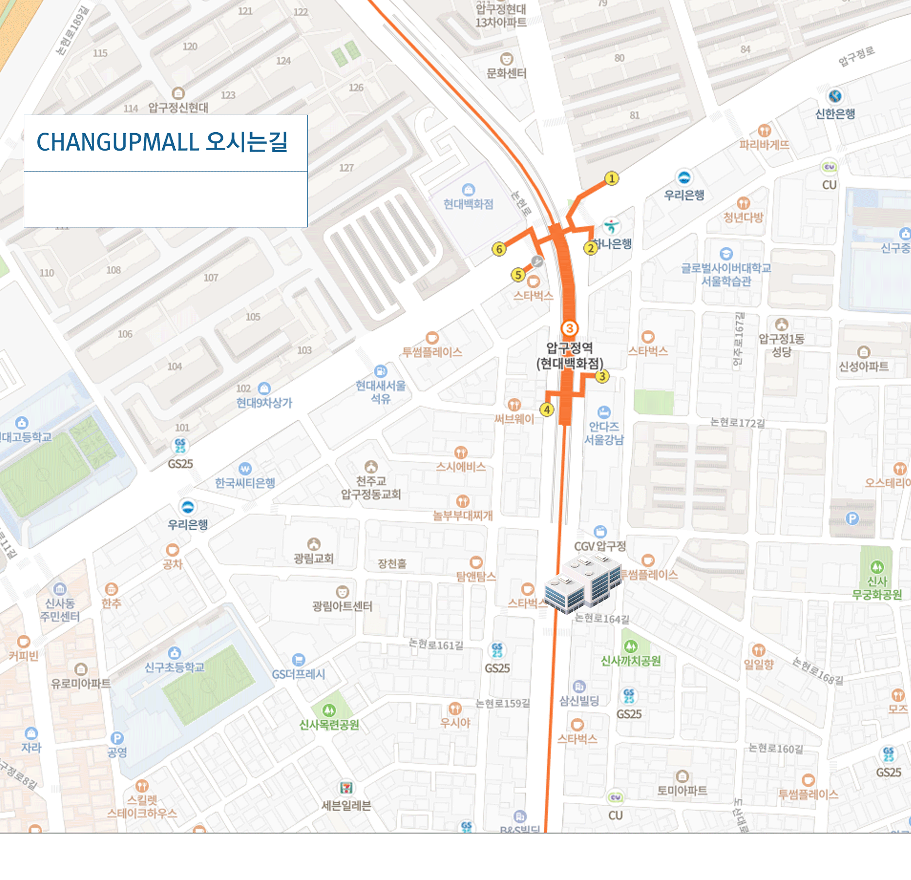 지하철 3호선 압구정역번출구 (약 80m직진)